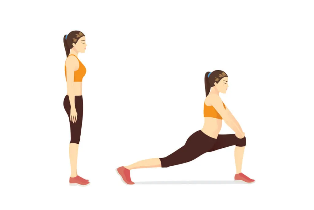 With one knee flat on the floor and one knee bent, keep your thigh parallel to the floor. Lean forward, stretching your hip towards the floor. Repeat on both sides. The hip flexor stretch assists in loosening up your hips, which prevents knees from being overworked.
